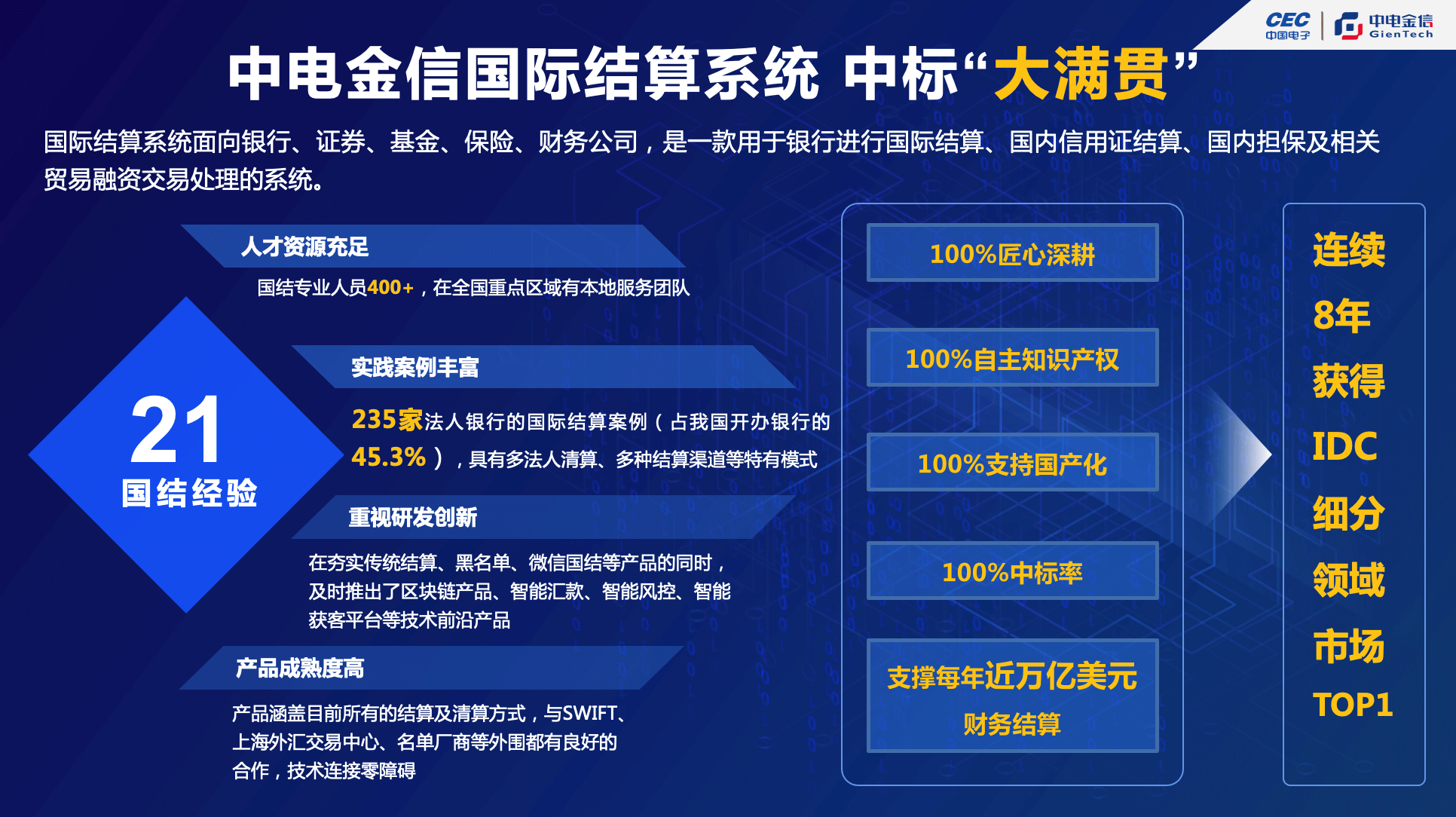 凭借上述技术优势,中电金信国际结算系统自2012年起,连续8年获得IDC中国银行业该细分领域第一名,具有近半数的国内市场份额及良好的客户口碑。每年支撑近万亿美元的结算,有力保障我国金融安全稳定和对外经济发展。