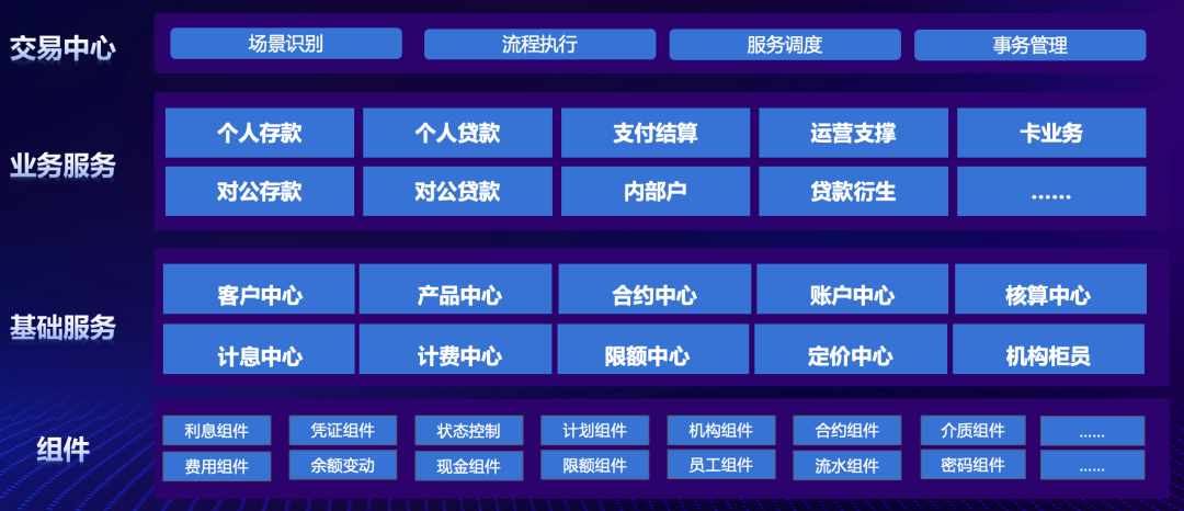 业务架构中,交易中心实现了面向客户体验和业务场景的流程编排和业务组装,具备高度的业务弹性,友好的客户体验,助力实现真正的以客户为中心;业务服务为银行提供了更灵活的选择,支持产品粒度的功能可替换,同时也能快速引入新的产品服务,支持未来业务发展,实现业务敏捷;基础服务提供包括产品、定价、账户、核算等在内的基础业务支撑能力,赋能银行业务服务的敏态创新。其构建的多个微服务应用,均可独立部署及运行,为银行提供了灵活的业务扩展、系统整合及生态开放能力。