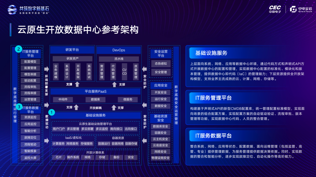 围绕云原生开放数据中心建设过程中出现的混合架构并存、监控运行管理、安全稳定运行、运维数字化转型、云技术栈选择、应用上云落地方面的痛点难题,中电金信结合多年的行业实践提出了云原生开放数据中心参考架构。云原生开放数据中心参考架构,是从数据中心架构咨询出发,支持数据中心云化,应用云原生部署,全组件可定制的开放解耦的数据中心架构体系,具有全栈代码定义、全栈开放解耦、全栈状态一致、全栈数据驱动的特点,可以实现数据中心的资源高效、应用敏捷、降本增效和持续改进。